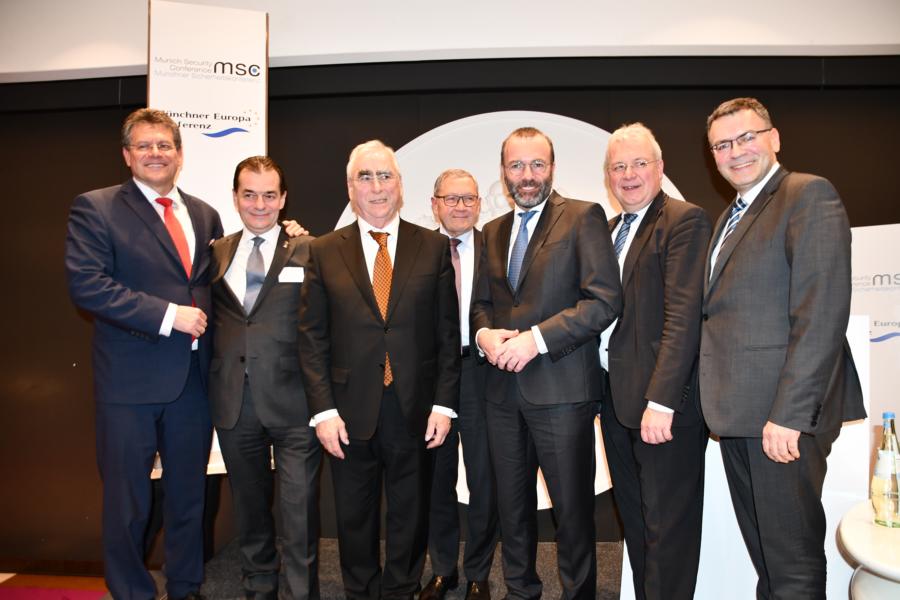 Vlnr: S.E. Maroš Šefčovič, Vizepräsident der Europäischen Kommission und Energiekommissar, S.E. Ludovic Orban, Premierminister von Rumänien, Dr. Theo Waigel Bundesminister a.D., Vorsitzender des Münchner Europa Konferenz e.V., Klaus P. Regling, Geschäftsführender Direktor des Europäischen Stabilitätsmechanismus ESM, Manfred Weber MdEP, EVP-Fraktionsvorsitzender, Markus Ferber MdEP, Dr. Florian Hermann, Leiter der bayerischen Staatskanzlei.